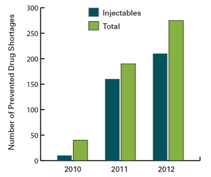 The second most common reason for drug shortages involves manufacturing delays caused by slowdowns and shutdowns for maintenance or remediation efforts (30%).4 Six of the top 10 manufacturers of sterile injectable drugs received warning letters from the FDA for serious violations of manufacturing standards between 2009 and 20129 which, in turn, required the manufacturers to address the concerns. The remediation efforts often require inspections, maintenance and equipment upgrades that either slow down or completely stop production of the drugs.