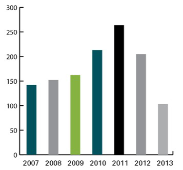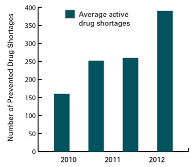 Over time, however, the number of reported shortages has increased. By 2011, the DSP recorded shortages of 251 drugs, quadruple the number of drug shortages in 1999. And the drug shortages were no longer regional but national. Approximately 63% of shortages reported between January 2007 and June 2013 lasted an average of 340 days.